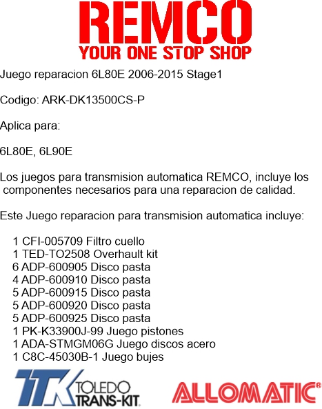 Los juegos para transmision automatica REMCO, incluye los componentes necesarios para una reparacion de calidad.