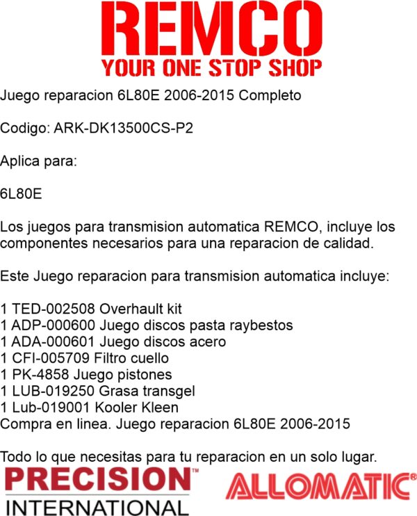 Los juegos para transmision automatica REMCO, incluye los componentes necesarios para una reparacion de calidad.
