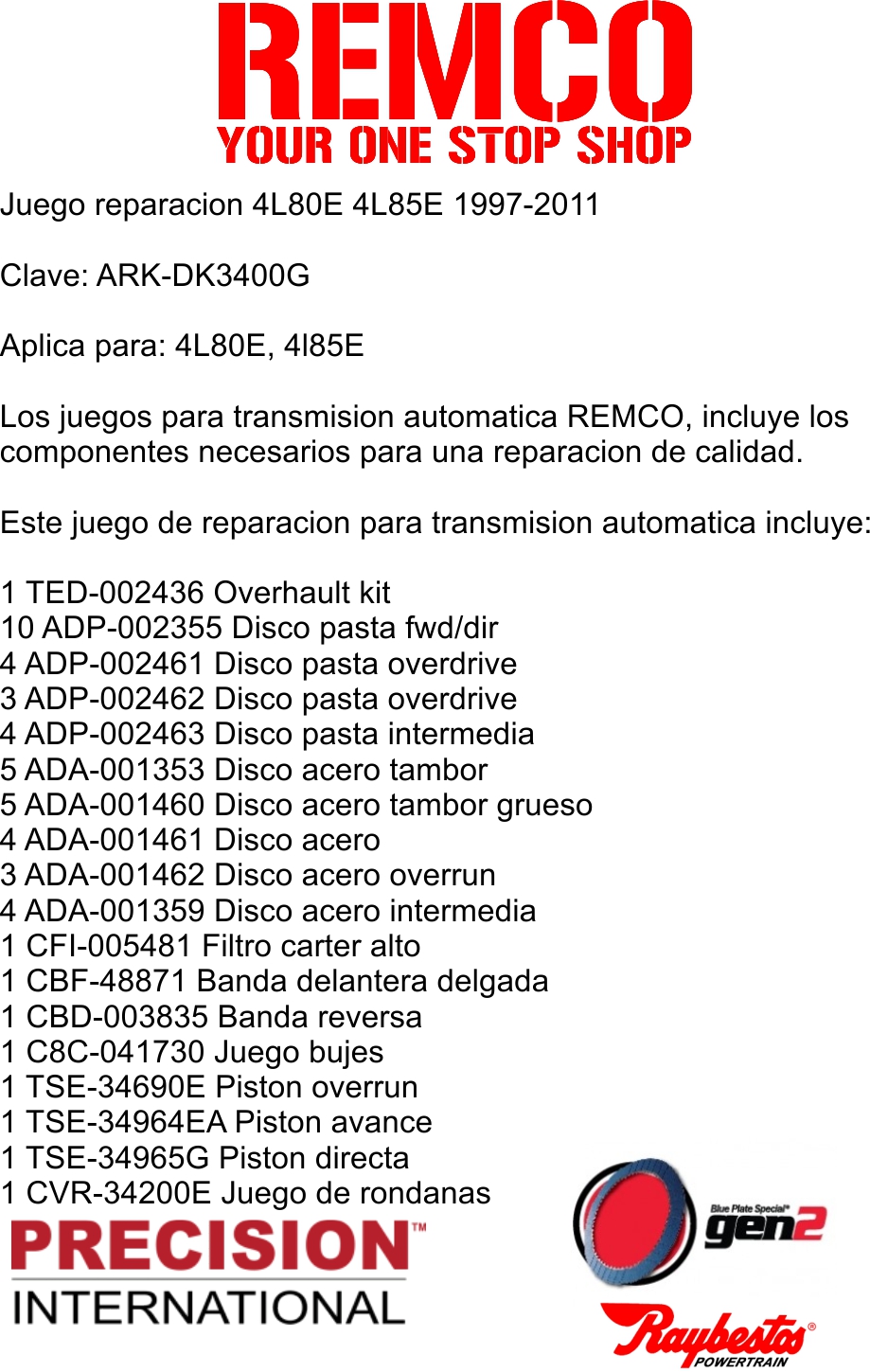 Los juegos para transmision automatica REMCO, incluye los componentes necesarios para una reparacion de calidad.