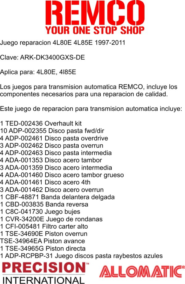 Los juegos para transmision automatica REMCO, incluye los componentes necesarios para una reparacion de calidad.
