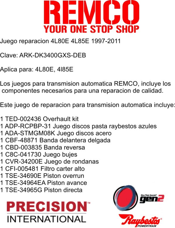 Los juegos para transmision automatica REMCO, incluye los componentes necesarios para una reparacion de calidad.