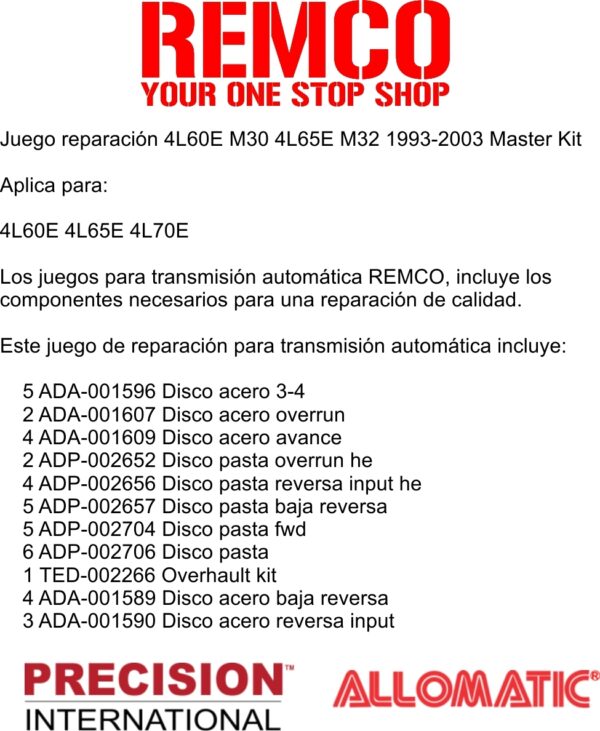 Los juegos para transmision automatica REMCO, incluye los componentes necesarios para una reparacion de calidad.