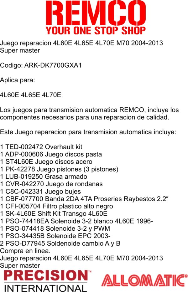 Los juegos para transmision automatica REMCO, incluye los componentes necesarios para una reparacion de calidad.