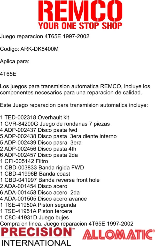 Los juegos para transmision automatica REMCO, incluye los componentes necesarios para una reparacion de calidad.