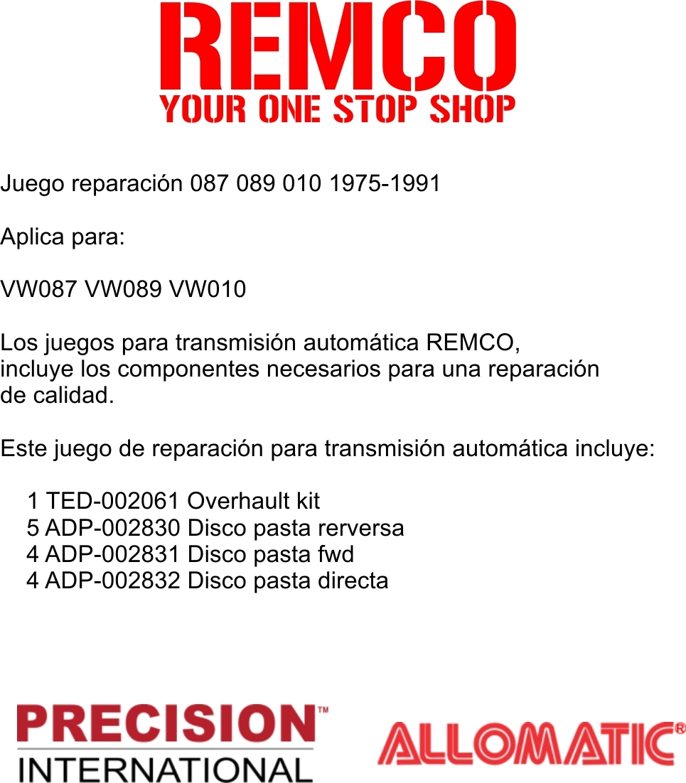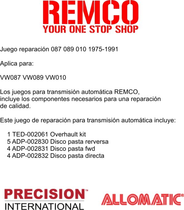 Los juegos para transmision automatica REMCO, incluye los componentes necesarios para una reparacion de calidad.