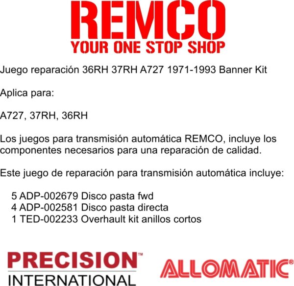 Los juegos para transmision automatica REMCO, incluye los componentes necesarios para una reparacion de calidad.