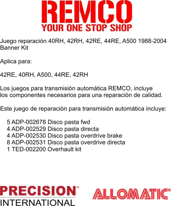 Los juegos para transmision automatica REMCO, incluye los componentes necesarios para una reparacion de calidad.