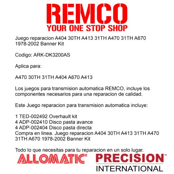 Juego reparacion A404 30TH A413 31TH A470 31TH A670 1978-2002 Banner Kit