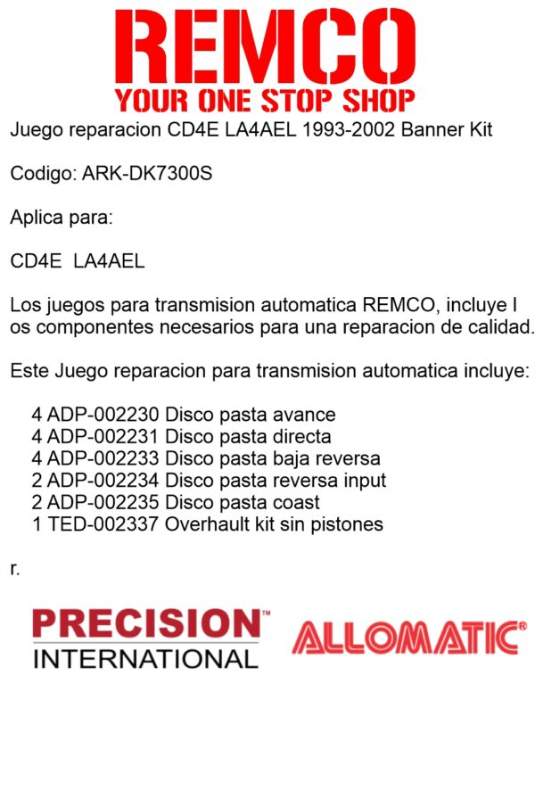 Los juegos para transmision automatica REMCO, incluye los componentes necesarios para una reparacion de calidad.