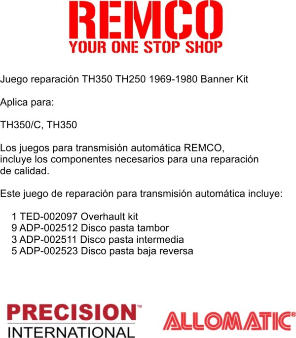 Los juegos para transmision automatica REMCO, incluye los componentes necesarios para una reparacion de calidad.