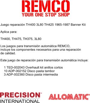 Los juegos para transmision automatica REMCO, incluye los componentes necesarios para una reparacion de calidad.