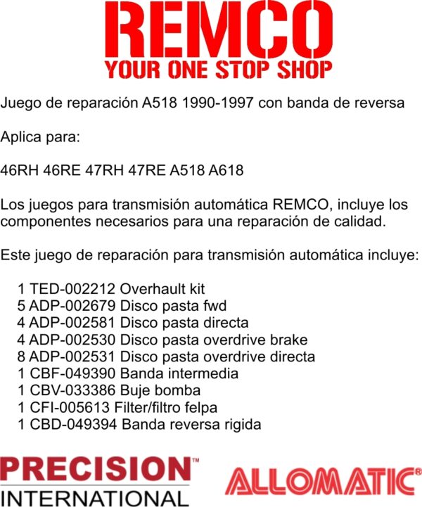 Los juegos para transmision automatica REMCO, incluye los componentes necesarios para una reparacion de calidad.