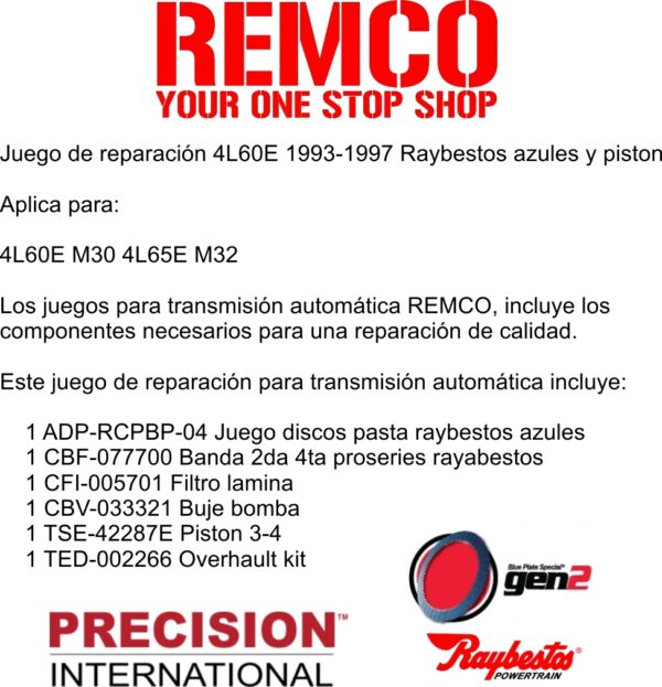 Los juegos para transmision automatica REMCO, incluye los componentes necesarios para una reparacion de calidad.