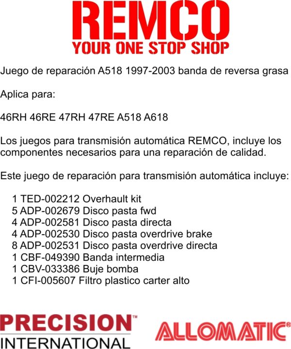Los juegos para transmision automatica REMCO, incluye los componentes necesarios para una reparacion de calidad.