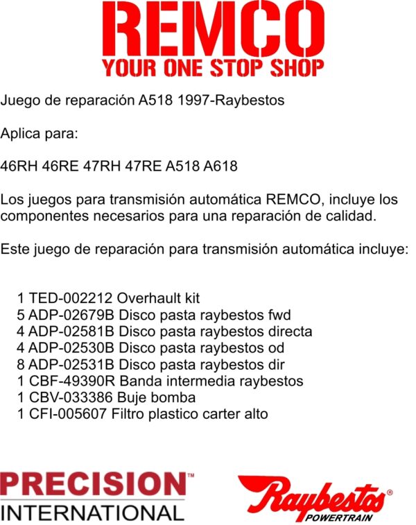 Los juegos para transmision automatica REMCO, incluye los componentes necesarios para una reparacion de calidad.