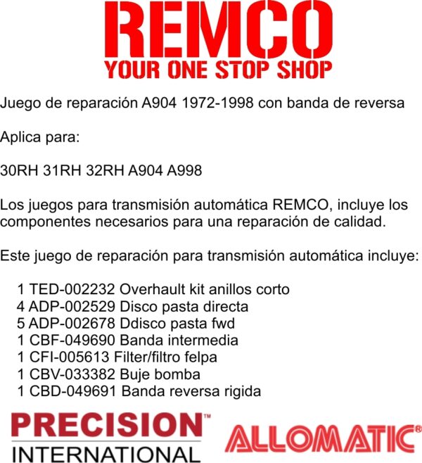 Los juegos para transmision automatica REMCO, incluye los componentes necesarios para una reparacion de calidad.