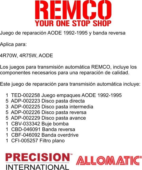 Los juegos para transmision automatica REMCO, incluye los componentes necesarios para una reparacion de calidad.