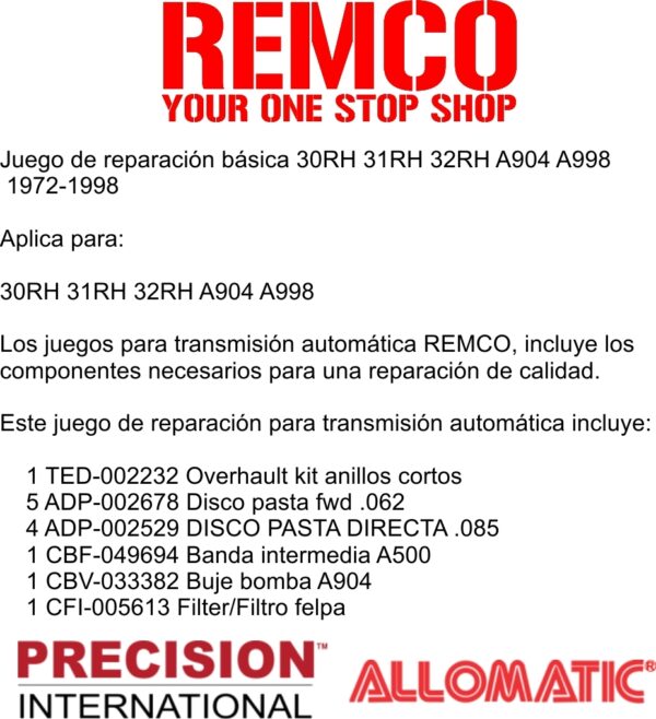 Los juegos para transmision automatica REMCO, incluye los componentes necesarios para una reparacion de calidad.