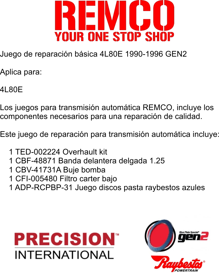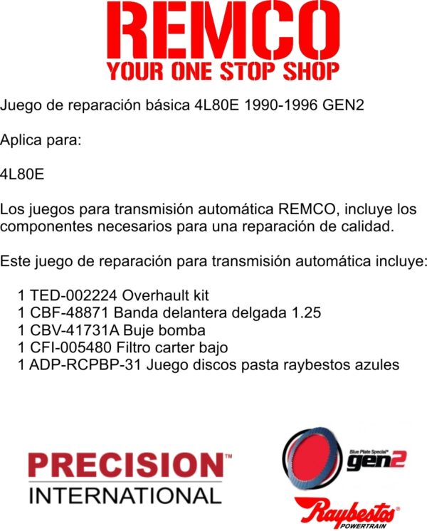 Los juegos para transmision automatica REMCO, incluye los componentes necesarios para una reparacion de calidad.