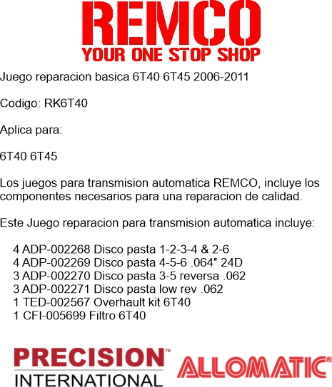 Los juegos para transmision automatica REMCO, incluye los componentes necesarios para una reparacion de calidad.