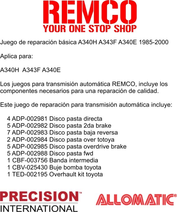 Los juegos para transmision automatica REMCO, incluye los componentes necesarios para una reparacion de calidad.