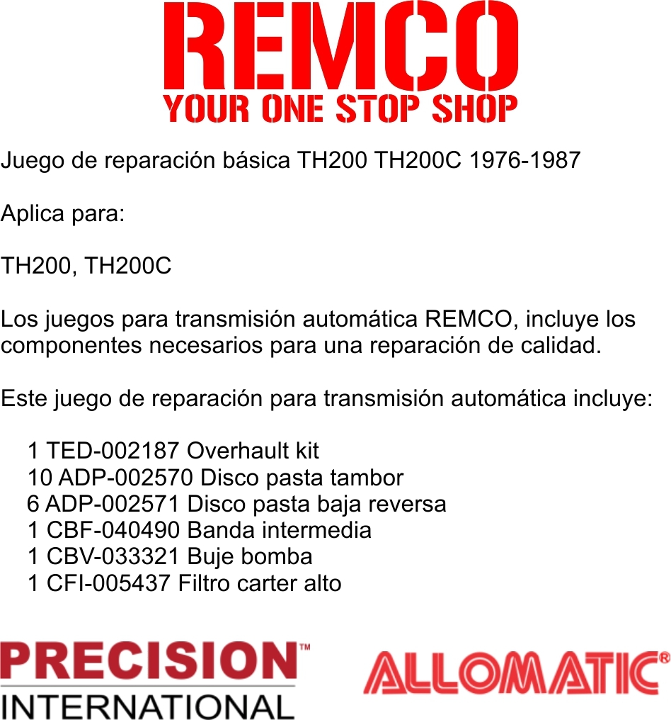 Los juegos para transmision automatica REMCO, incluye los componentes necesarios para una reparacion de calidad.