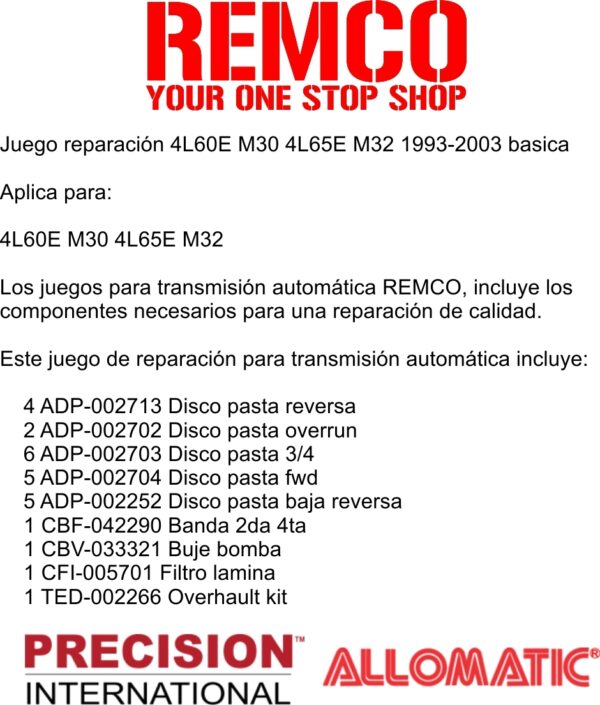 Los juegos para transmision automatica REMCO, incluye los componentes necesarios para una reparacion de calidad.