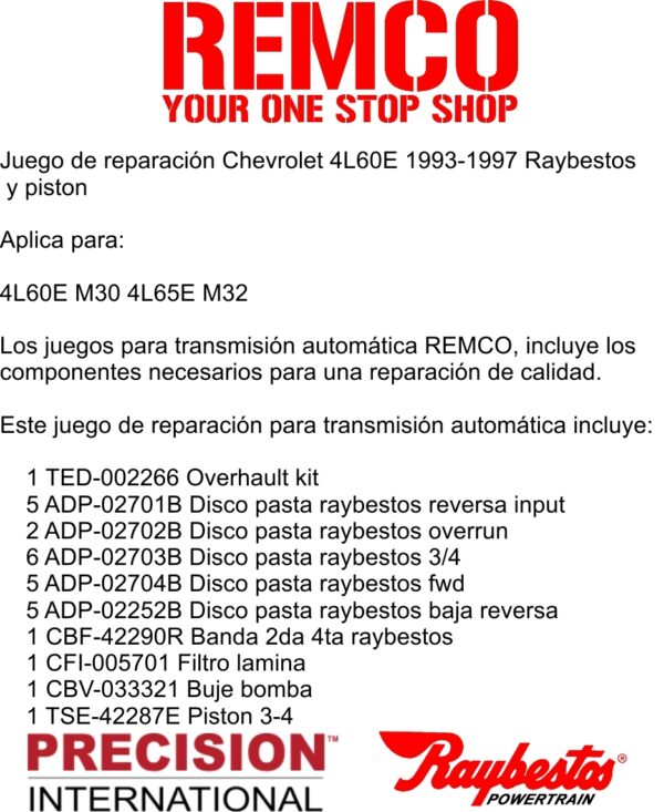 Los juegos para transmision automatica REMCO, incluye los componentes necesarios para una reparacion de calidad.