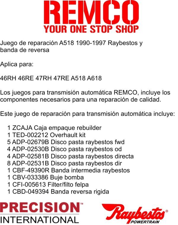 Los juegos para transmision automatica REMCO, incluye los componentes necesarios para una reparacion de calidad.