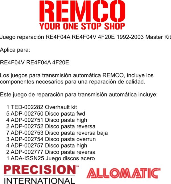 Los juegos para transmision automatica REMCO, incluye los componentes necesarios para una reparacion de calidad.