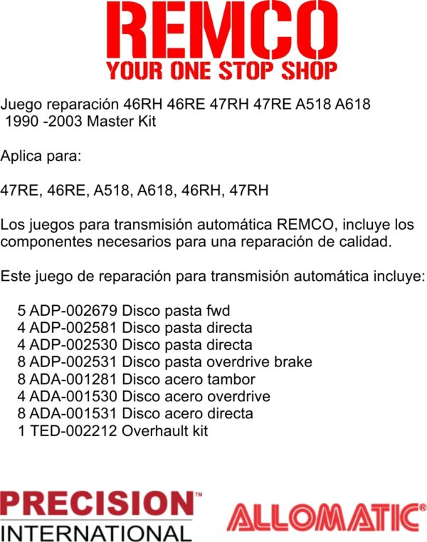 Los juegos para transmision automatica REMCO, incluye los componentes necesarios para una reparacion de calidad.