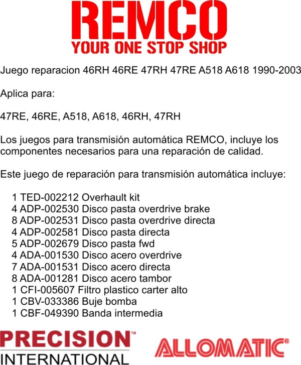 Los juegos para transmision automatica REMCO, incluye los componentes necesarios para una reparacion de calidad.