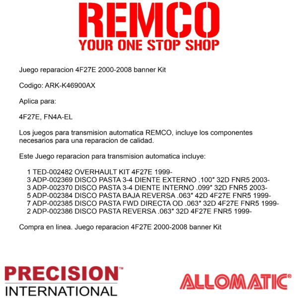 Los juegos para transmision automatica REMCO, incluye los componentes necesarios para una reparacion de calidad.