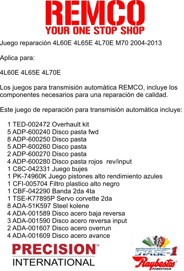 Los juegos para transmision automatica REMCO, incluye los componentes necesarios para una reparacion de calidad.