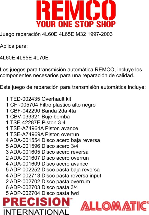 Los juegos para transmision automatica REMCO, incluye los componentes necesarios para una reparacion de calidad.