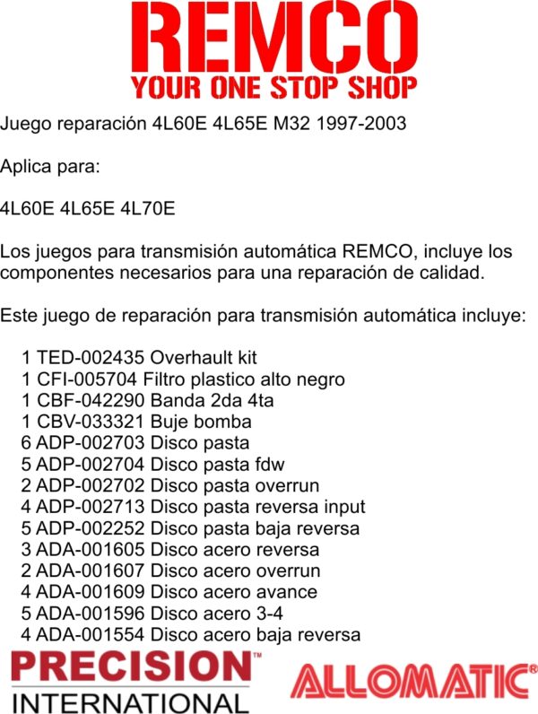 Los juegos para transmision automatica REMCO, incluye los componentes necesarios para una reparacion de calidad.