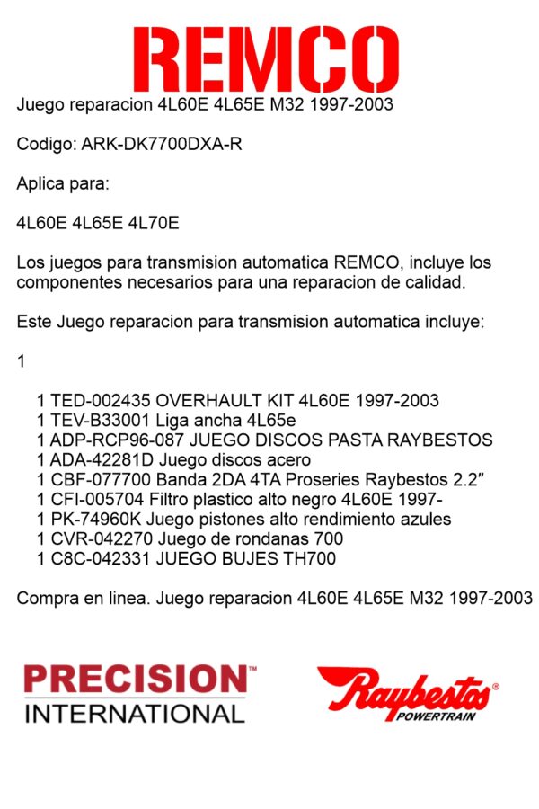 Los juegos para transmision automatica REMCO, incluye los componentes necesarios para una reparacion de calidad.