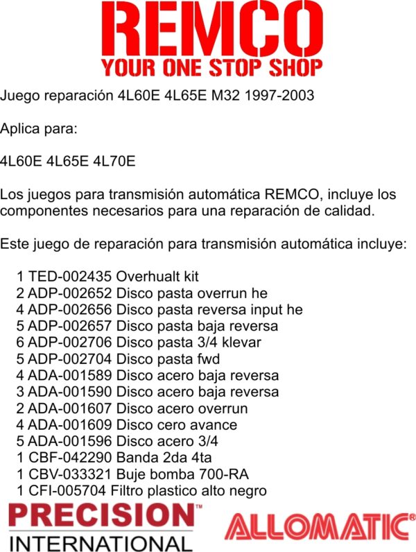 Los juegos para transmision automatica REMCO, incluye los componentes necesarios para una reparacion de calidad.