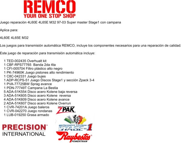 Los juegos para transmision automatica REMCO, incluye los componentes necesarios para una reparacion de calidad.