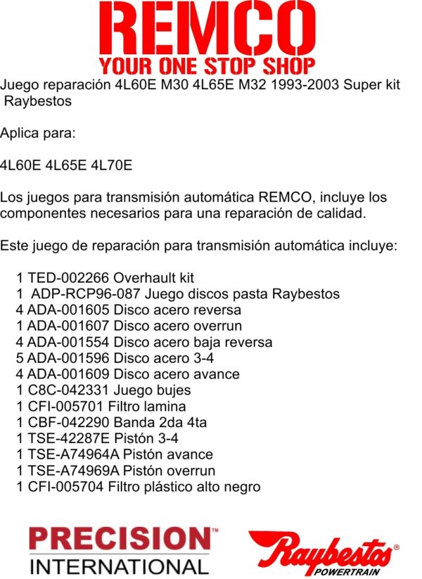 Los juegos para transmision automatica REMCO, incluye los componentes necesarios para una reparacion de calidad.