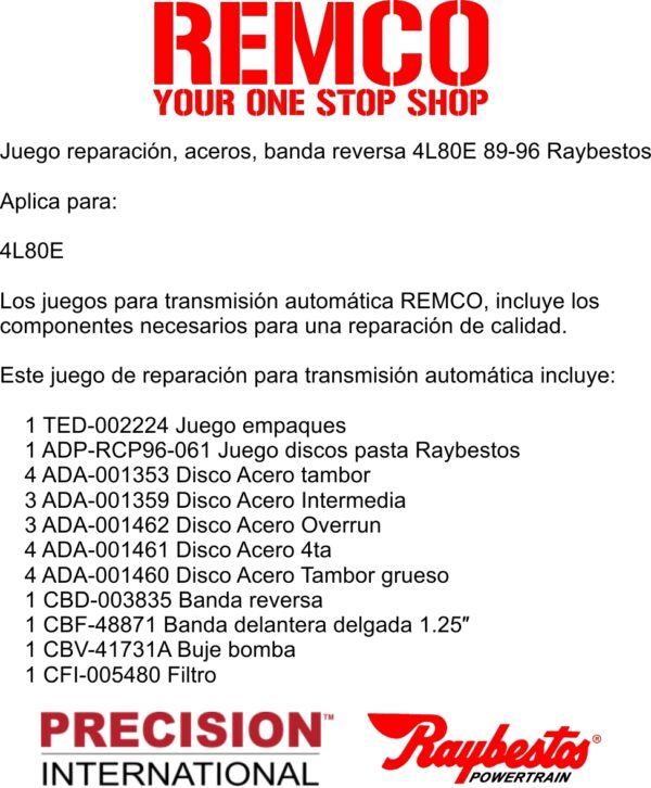 Los juegos para transmision automatica REMCO, incluye los componentes necesarios para una reparacion de calidad.