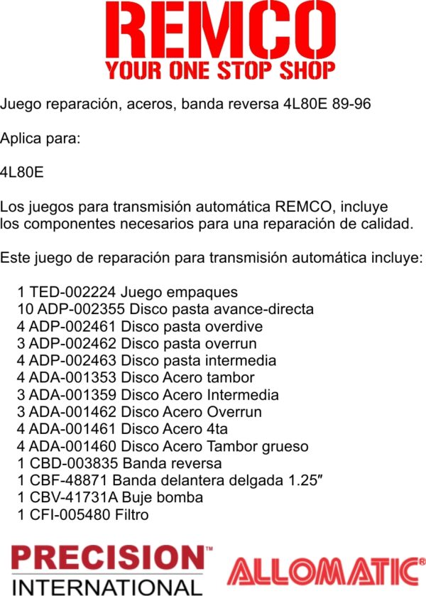 Los juegos para transmision automatica REMCO, incluye los componentes necesarios para una reparacion de calidad.