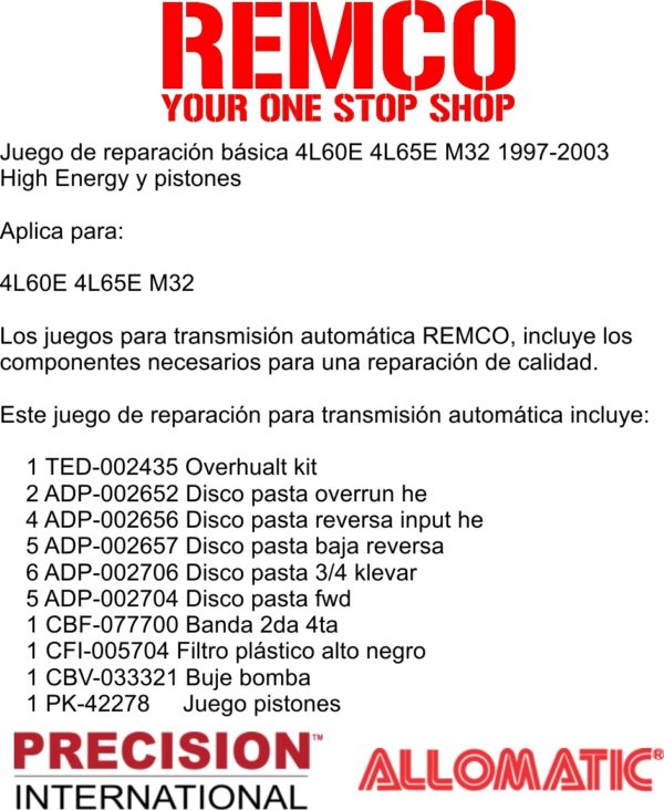 Compra en linea. Juego reparacion basica 4L60E 4L65E M32 1997-2003 High Energy y pistones