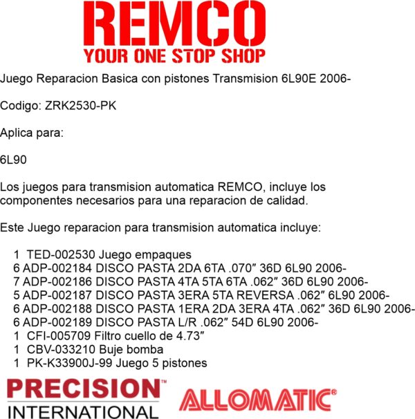 Los juegos para transmision automatica REMCO, incluye los componentes necesarios para una reparacion de calidad.
