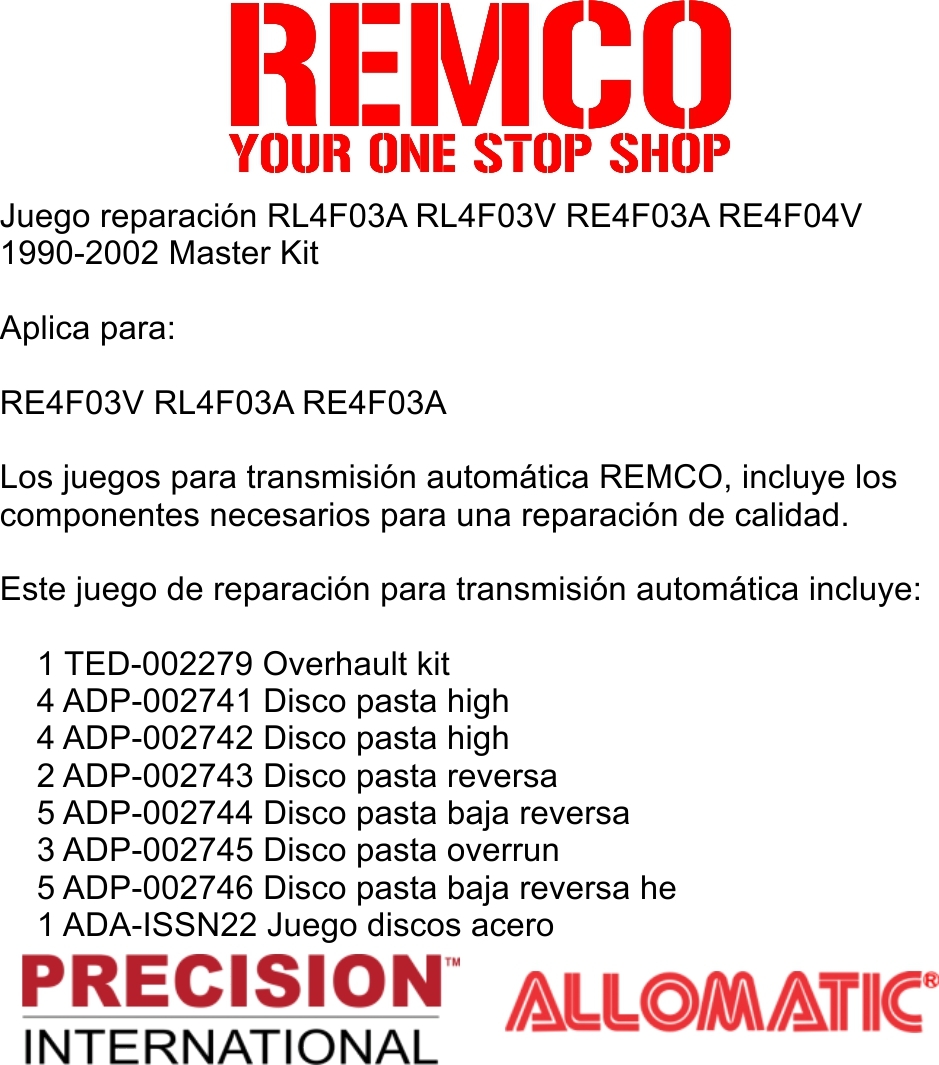 Los juegos para transmision automatica REMCO, incluye los componentes necesarios para una reparacion de calidad.