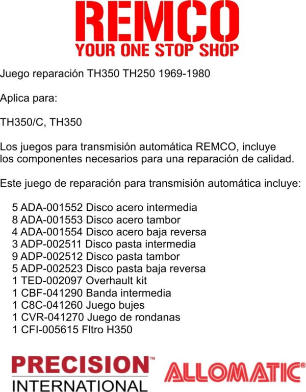 Los juegos para transmision automatica REMCO, incluye los componentes necesarios para una reparacion de calidad.