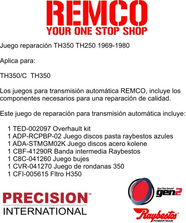 Los juegos para transmision automatica REMCO, incluye los componentes necesarios para una reparacion de calidad.