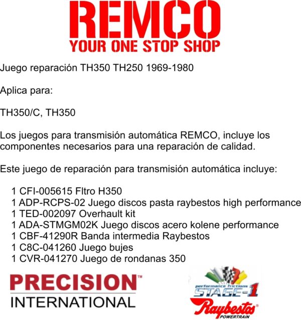 Los juegos para transmision automatica REMCO, incluye los componentes necesarios para una reparacion de calidad.