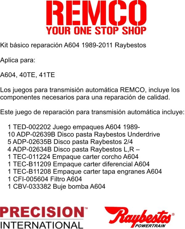 Los juegos para transmision automatica REMCO, incluye los componentes necesarios para una reparacion de calidad.