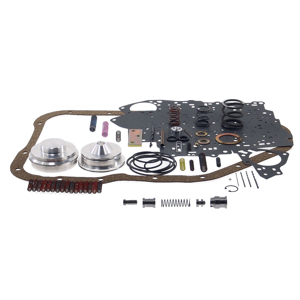 Tambien incluye: Calibracion para multiples tipos de cuerpos de valvulas El nuevo circuito del tercer embrague de alimentacion dual aumenta el par de retencion del tercer embrague en un 200% El segundo servo piston Billet aumenta el par de sujecion de la banda